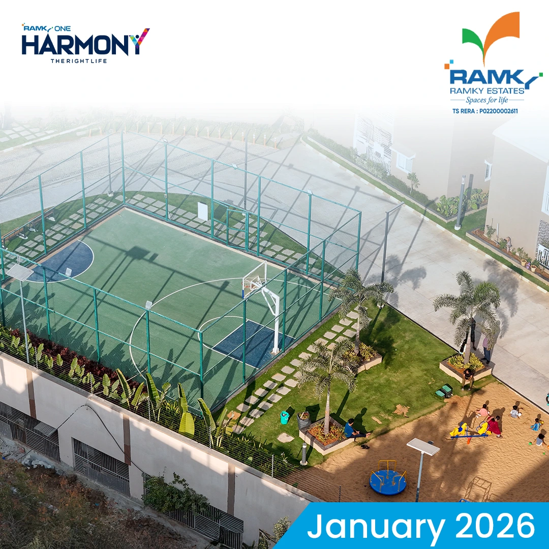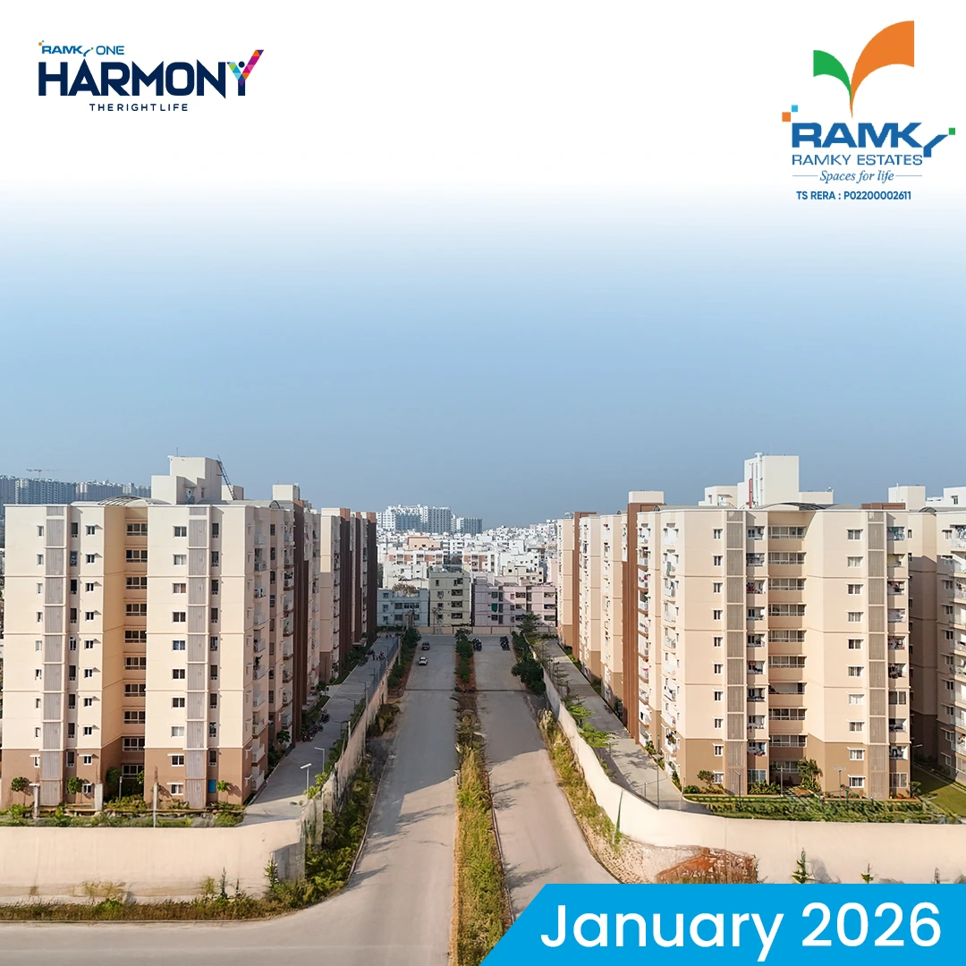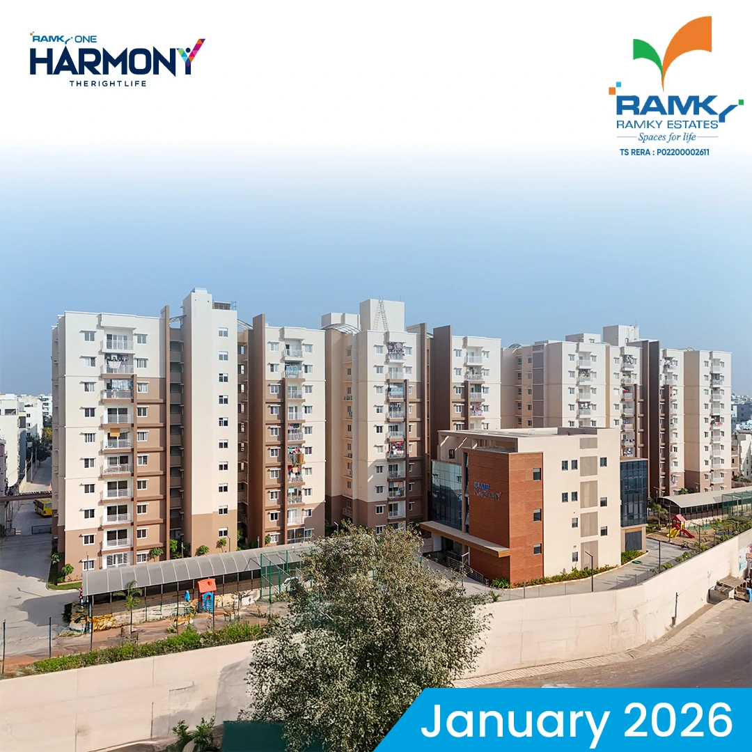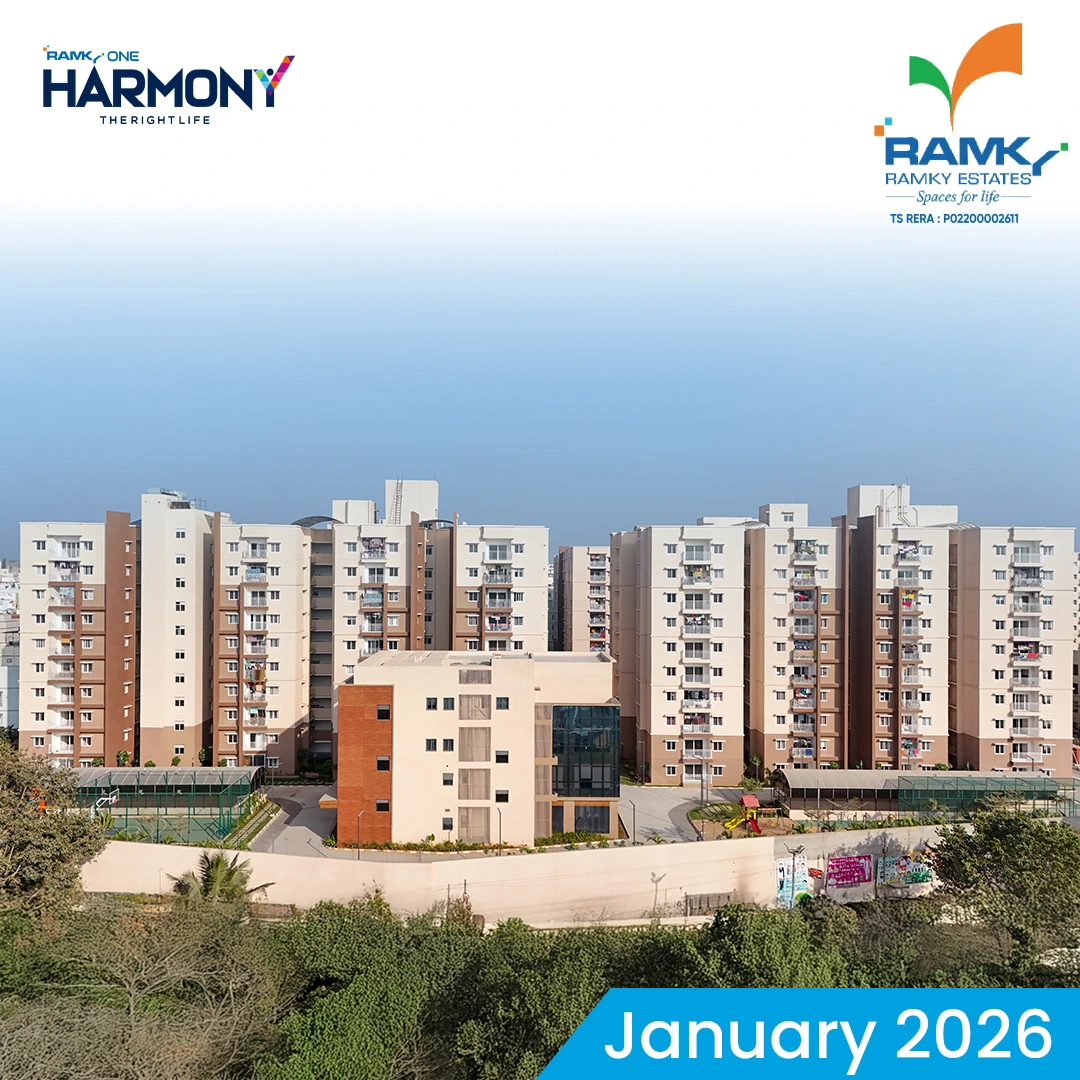 2 BHK units now completely sold out, Ramky One Harmony presents a limited inventory of spacious 3 BHK Flats for Sale in Hyderabad. Designed with functional layouts, top-tier specifications, and open green landscapes, the project is ideal for those who value quality, location, and immediate possession.